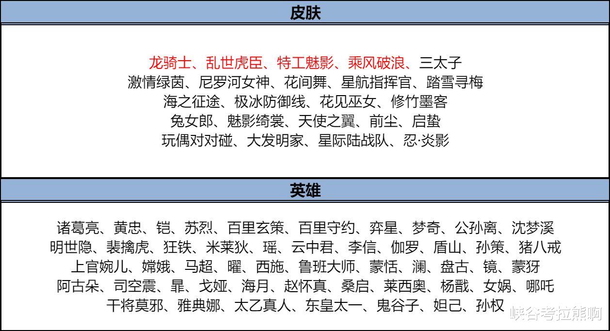 本次没有新的皮肤上线皮肤商店,仅建议优先兑换龙骑士、乱世虎臣、特工魅影、乘风破浪四款史诗皮肤,勇者皮肤建议兑换花间舞和魅影绮裳。