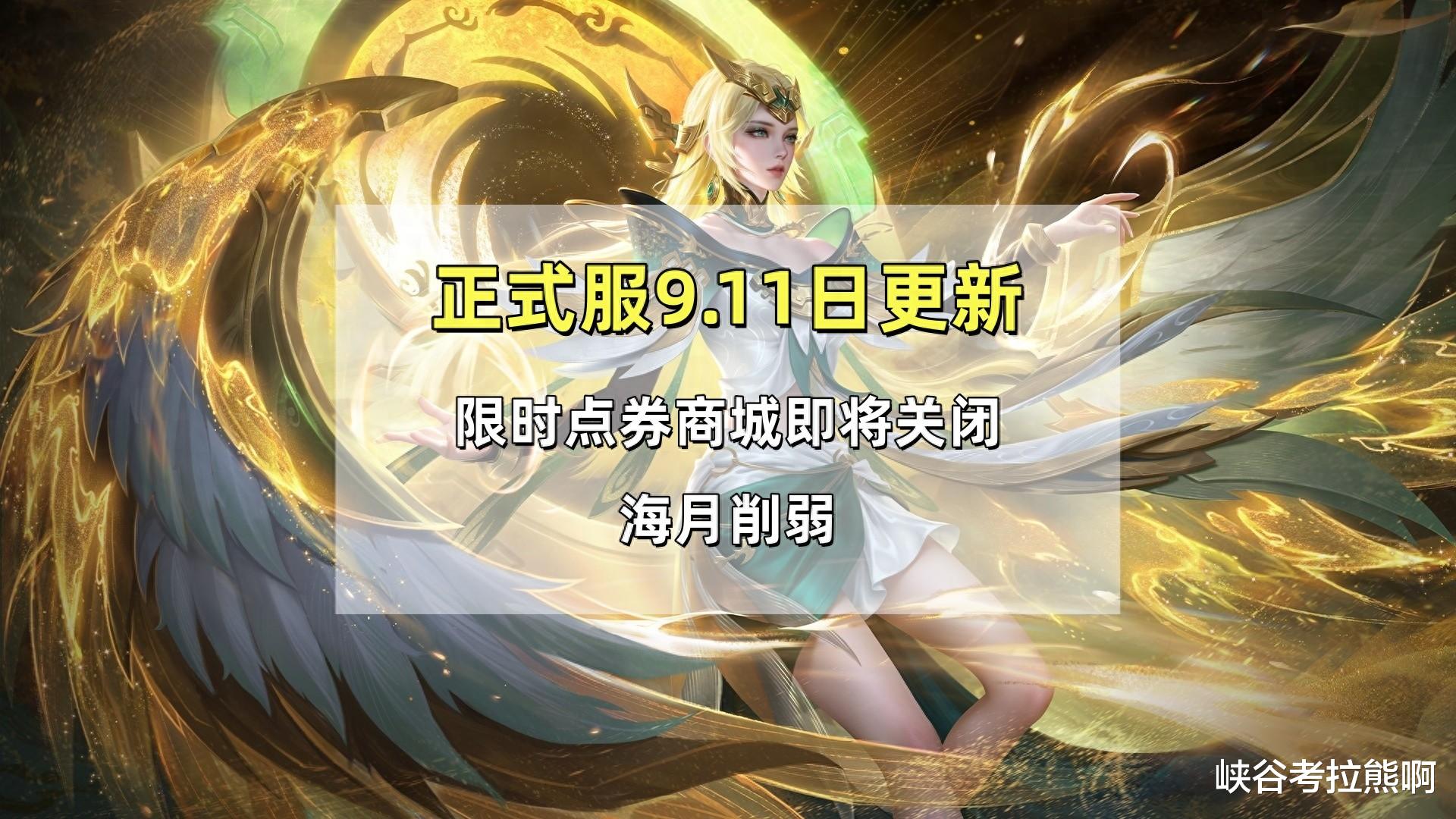 《王者荣耀》正式服将于9月11日迎来版本更新,英雄方面海月迎来削弱。活动方面,限时点券商城即将关闭,公孙离涂山容容碎片兑换方式即将结束,海战新玩法上线,碎片商店更新。