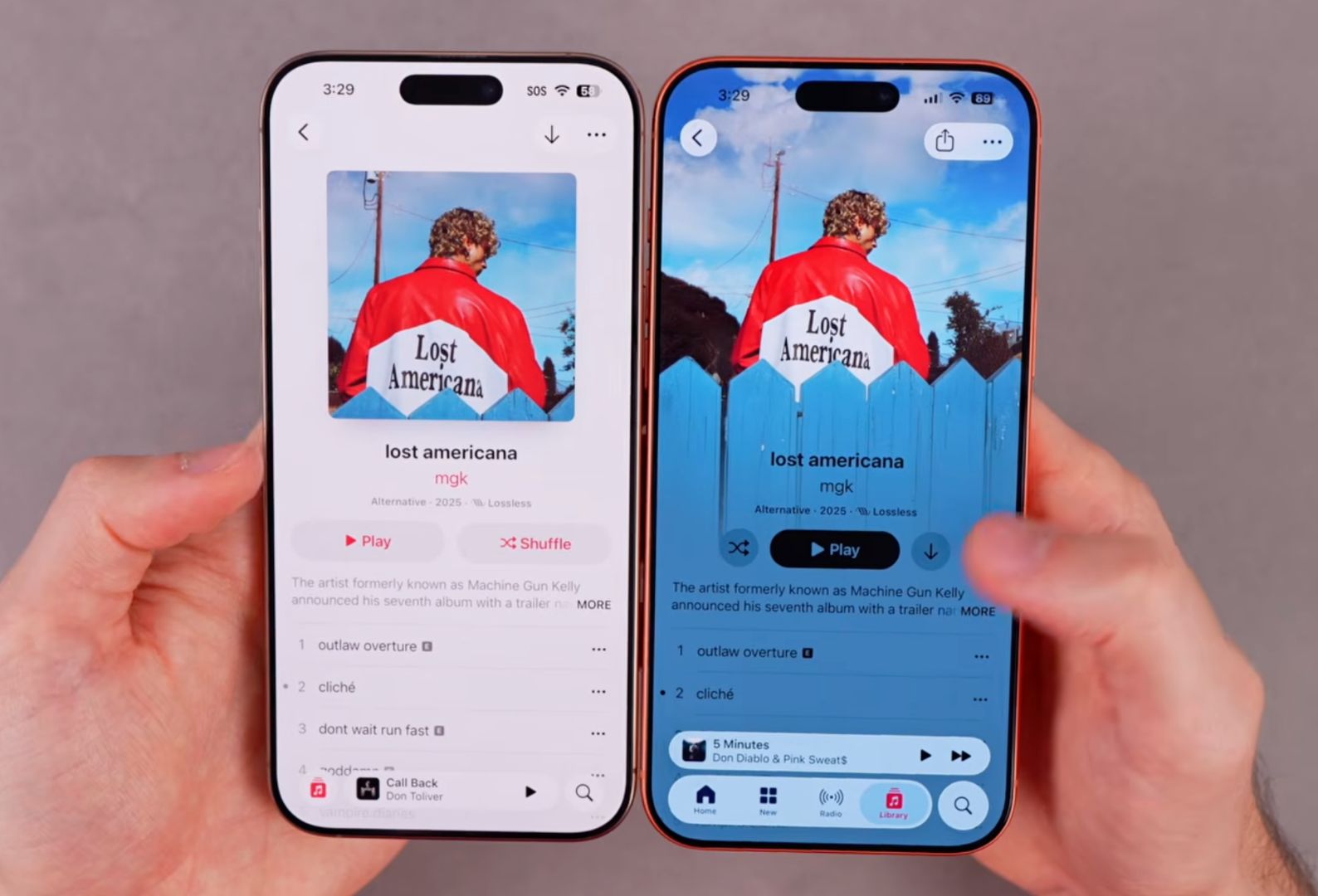 Apple Music 的专辑与歌单界面被整体重绘,封面直接全屏铺开,系统根据封面色彩生成动态模糊背景。