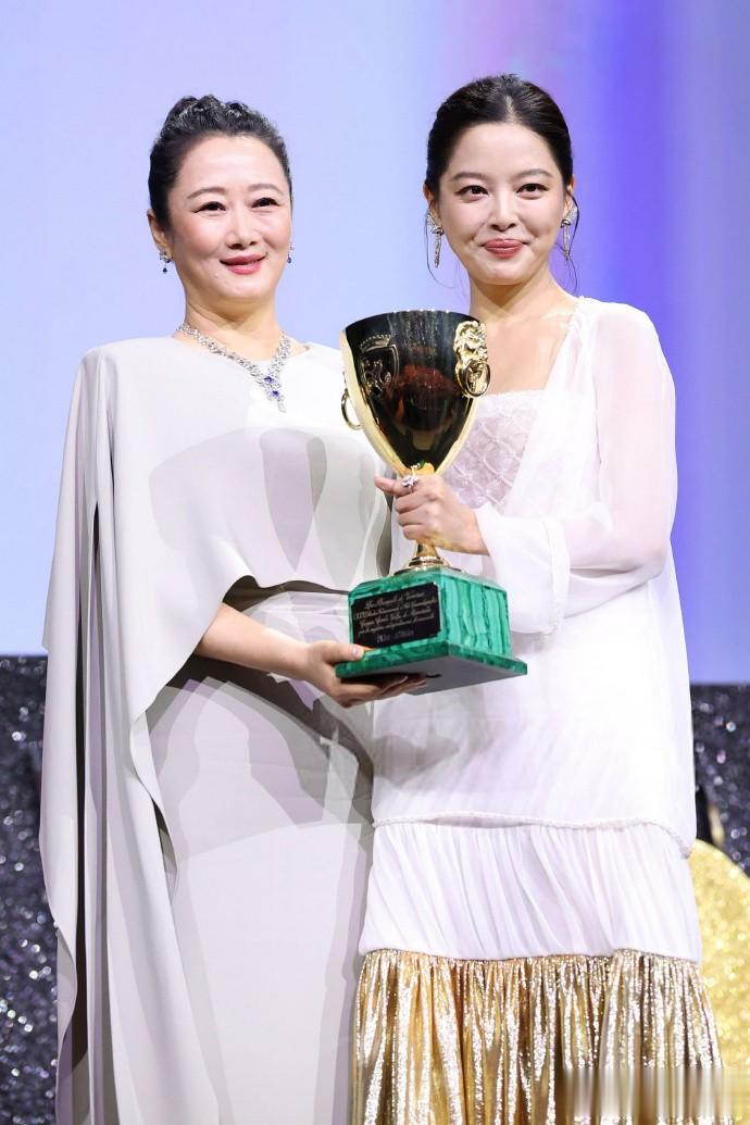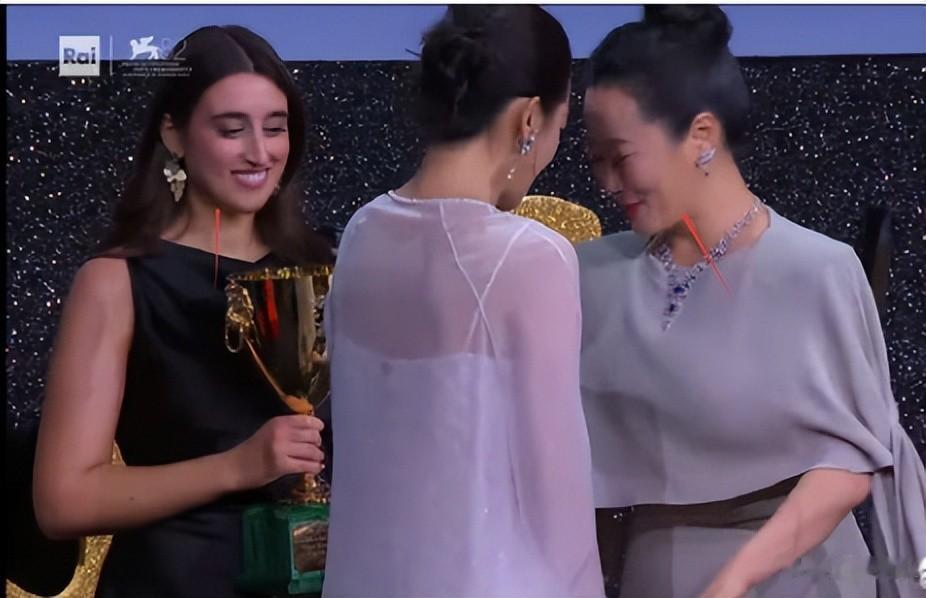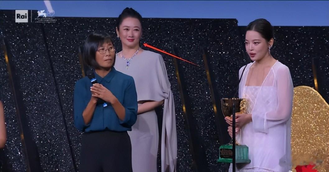 这届威尼斯电影节最开心的人除了辛芷蕾,非赵涛莫属。辛芷蕾抱着奖杯,用中文发表获奖感言的时候,赵涛在后面非常欣慰的看着辛芷蕾。