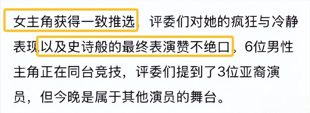 却能够凭借这部电影压过宋佳倪妮张小斐等一批有强有力奖项和代表作的女演员。甚至能够把拿过影后的文淇也放在后面。