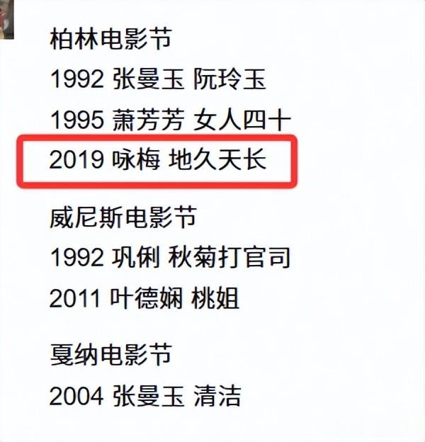 女演员上一次还是2019年,咏梅凭借《地久天长》拿下柏林影后。