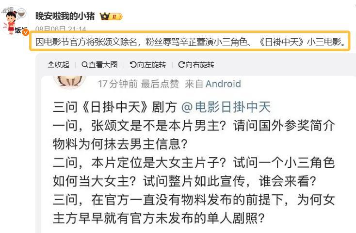 更是因为电影节将张颂文除名,辱骂辛芷蕾所演角色,上升到整部电影都有问题。