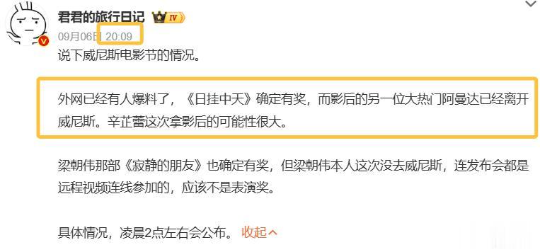 随后又曝出了,另一位大热门影后阿曼达已经离开威尼斯。所以,大家都以为辛芷蕾这次拿影后可能性很大。