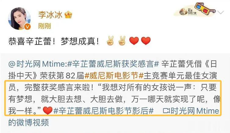 李冰冰真诚祝福,恭喜辛芷蕾,梦想成真!