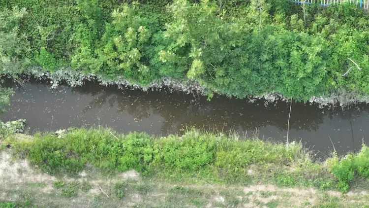 最引人注目的当属污水沉淀区。长期排放的污水在此形成了一个小型池塘,沉淀后的污泥覆盖面积近10亩。其中一处污水呈现出诡异的翠绿色,且现场未采取任何防渗漏措施。沉淀区南侧的水沟积满乌黑污水,沟边树木下侧附着一层白色物质,污染状况触目惊心。