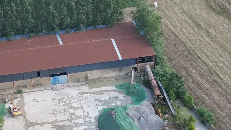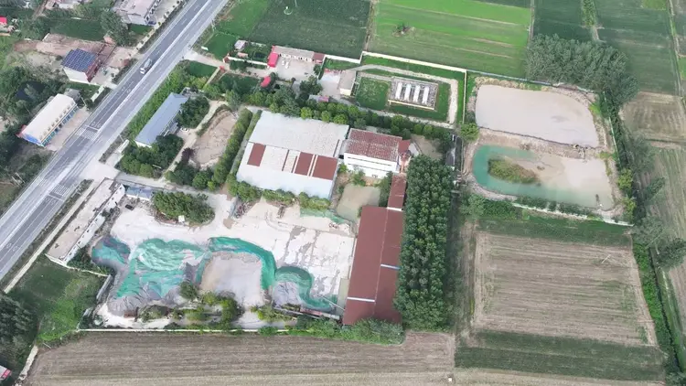 在村民指引下,记者来到与留庄镇叶庄村仅一路之隔的洗沙场。通过航拍视角可见,整个洗沙场可划分为四个功能区:堆积如山的石粉原料区,厂房内机器轰鸣的生产区,成品细沙堆放区,以及浑浊不堪的污水沉淀区。