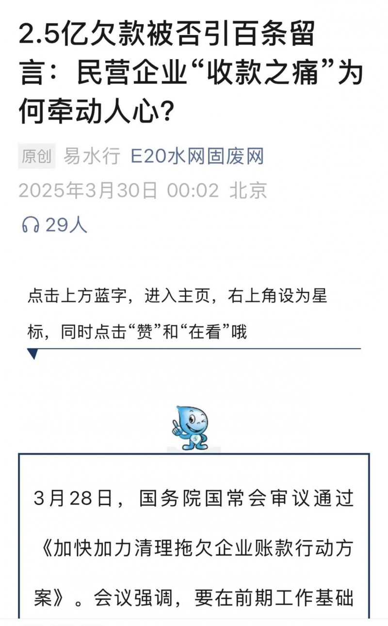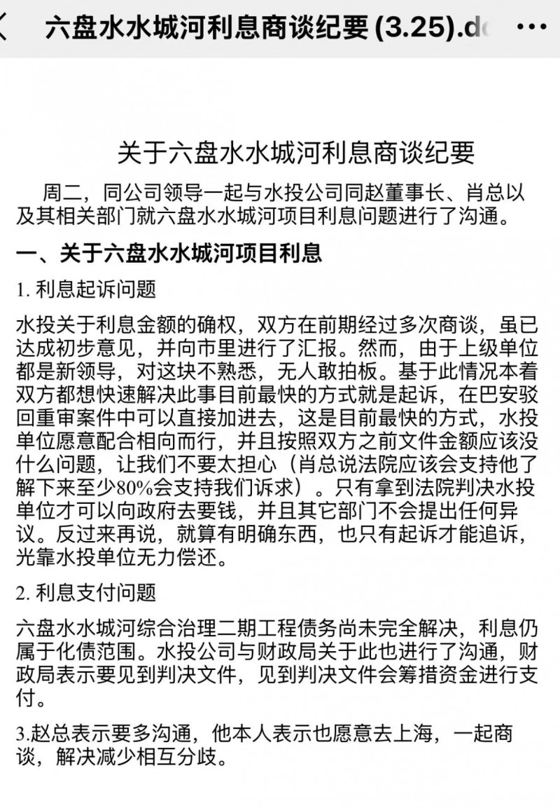 面对媒体无数的转载和质疑,一方面水投公司召集我司在现场项目经理等,要求巴安水务起诉状中加上2.5亿左右的利息款,因为他们付不起立案费用,在巴安面前装可怜。以下是2025年3月25日水投公司董事长、总经理等人与我司开会商谈利息的会议纪要。从会议纪要中看到,新来的市领导其实是同意支付这笔款的,但光有水投的确认不够,需要法院的判决书才能支付。