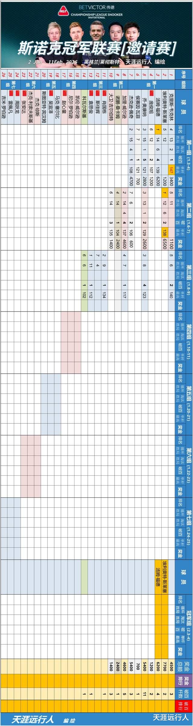 最新即时更新斯诺克冠军联赛邀请赛版进程签表,一表看斯诺克冠军联赛全程,敬请各位看官老师转发收藏,以备不时之需