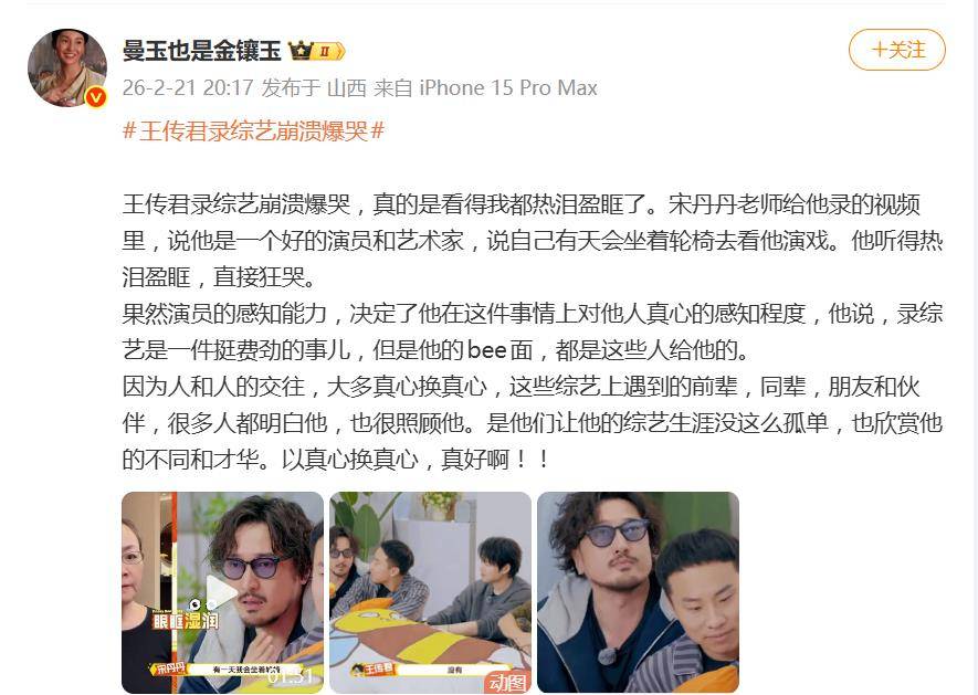 据网友2月21日晚间爆料,在综艺《周五晚高疯》里,王传君因为宋丹丹老师的一段视频信,直接趴在徐志胜肩上哭到失控。这一幕真情“破防”,瞬间冲上热搜,也让无数网友感慨:在娱乐圈这个名利场,原来“真心换真心”还能有如此猛烈的化学反应。