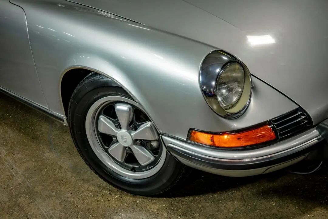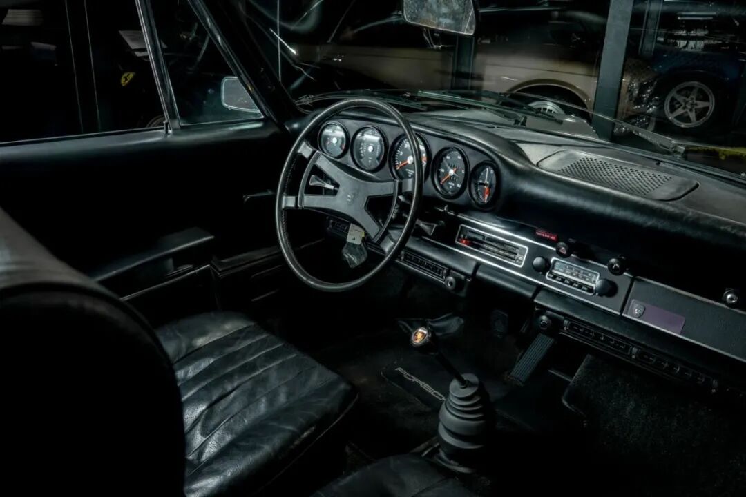 更难得的是它的“零改装原厂血统”。从1973年在美国密歇根州伯明翰的Tom Sullivan保时捷4S店交付至今,这台车从未经过任何非原厂改动,车身覆盖件、机械部件、内饰配置全都是出厂时的模样。经典的金属银色车漆搭配黑色真皮内饰,是保时捷最具辨识度的配色组合之一,历经半个世纪依旧光泽饱满。