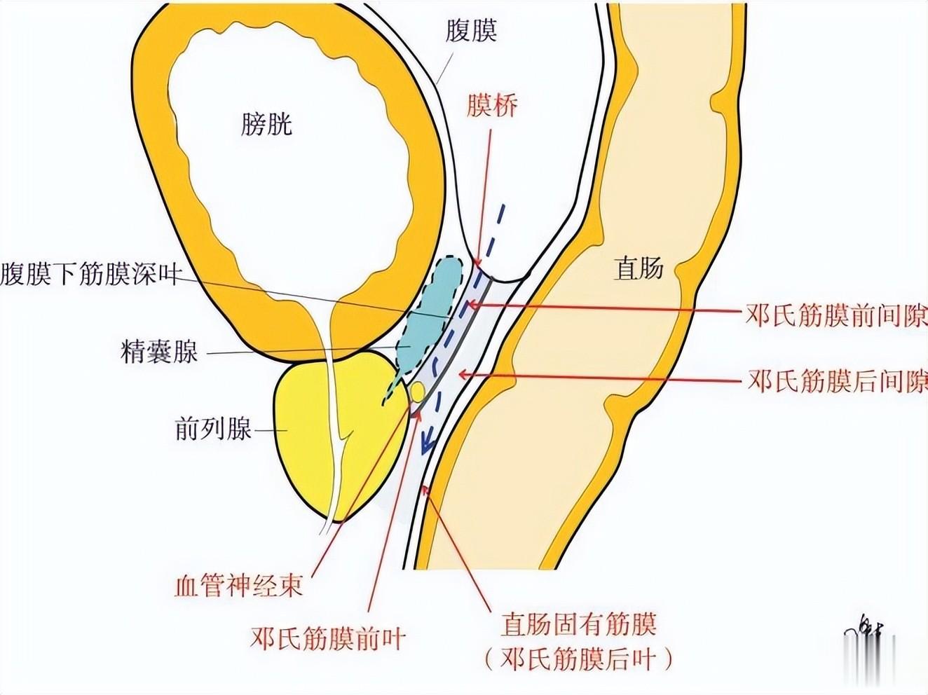 邓氏筋膜(Denonvilliers筋膜)是位于直肠前方的一层致密结缔组织,将直肠与前列腺、精囊腺等结构分隔开。它起自盆底腹膜反折处,向下止于会阴体,呈薄膜状。