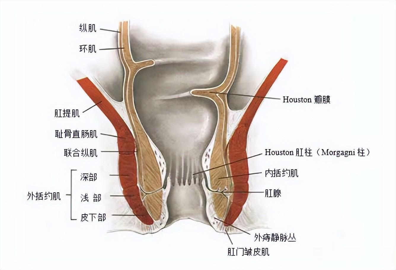 肛管的平滑肌与其他部分肠壁一样,由内层的环形肌和外层的纵行肌构成,环形肌在肛管处特别增厚,形成“肛门内括约肌(internal sphincter muscle of anus)”,而围绕在肛门内括约肌周围的是“肛门外括约肌(external sphincter muscle of anus),肛门外括约肌属于骨骼肌,专司排便机能,为肛门的随意肌。肛管从内向外分为5层:粘膜层,粘膜下层,肛门内括约肌,联合纵肌,肛门外括约肌。
