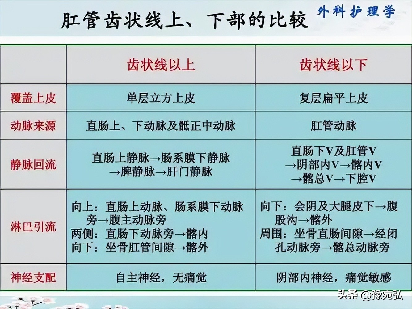 6、肛梳:齿状线下方因肛门内括约肌收缩而形成的环形隆起、宽约10~15mm,称为“肛梳”或“痔环”,其表面光滑,深面有静脉丛,故而呈浅蓝色。肛梳下缘即为“白线”。