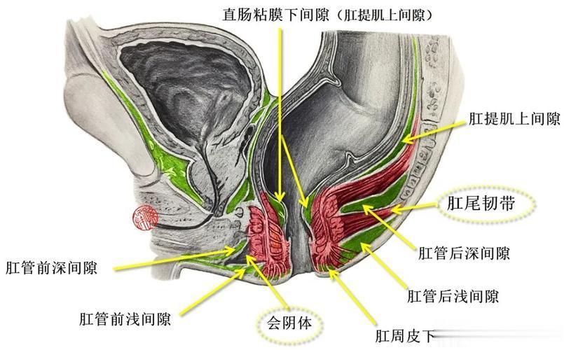 肛管后深间隙(Court-moy氏间隙)位于肛尾韧带的深面,是两侧坐骨直肠间隙相互沟通的通道。一旦感染,脓液可经此间隙蔓延至对侧,形成严重的后蹄铁形肛瘘。 肛管后浅间隙则位于肛尾韧带的浅面,与皮肤之间。此间隙感染通常较表浅,多由肛裂引起,脓肿一般不会向深部扩散。 肛管前深间隙位于会阴中心腱的深面,虽然也与两侧坐骨直肠间隙相通,但临床上因此形成前蹄铁形肛瘘的情况较为少见。 肛管前浅间隙位于会阴中心腱的浅面,感染通常也仅局限于邻近的皮下组织。