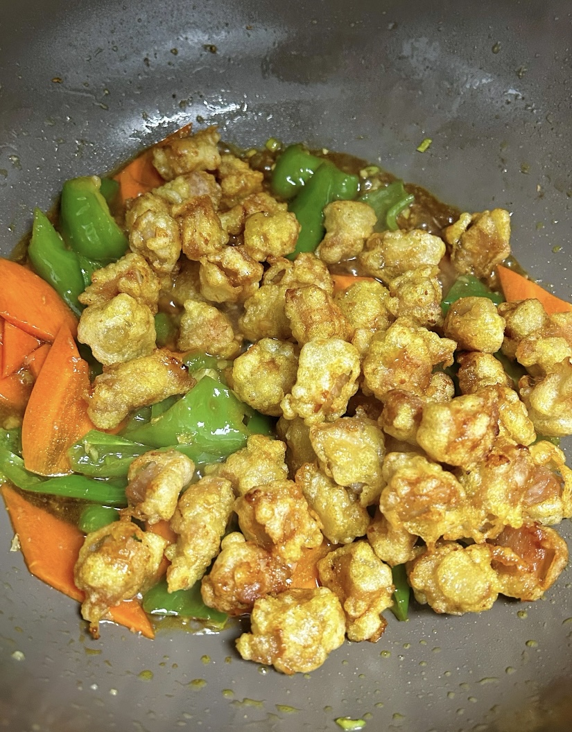 炸好肉丁后,锅中留少许底油,放入葱蒜末炒香,然后下入青椒和胡萝卜块,快速翻炒至断生。接着将炸好的肉丁倒入锅中,与蔬菜一起翻炒均匀。最后倒入调好的料汁,转大火快速翻炒,让料汁均匀地裹在肉丁和蔬菜表面。这一步要注意火候的控制,大火快炒能让料汁迅速收浓,使菜品更加入味,同时保持蔬菜的脆嫩口感。
