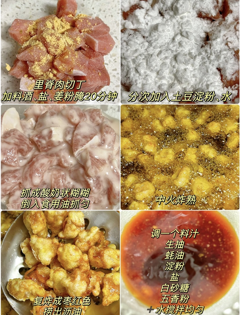 腌制好的肉丁需要裹上一层淀粉糊。图片中展示了关键的一步:分次加入土豆淀粉和水,将肉丁抓拌成酸奶状的糊糊,然后再倒入少量食用油抓匀。这一步的目的是让淀粉糊更好地包裹在肉丁表面,形成一层薄而均匀的保护膜。土豆淀粉的黏性较强,能让肉丁在炸制过程中保持外皮酥脆,而内部的肉质则能保持鲜嫩多汁。加入食用油抓匀后,肉丁之间不易粘连,炸出来的效果更加均匀。