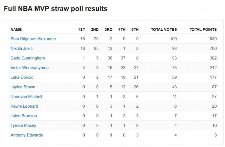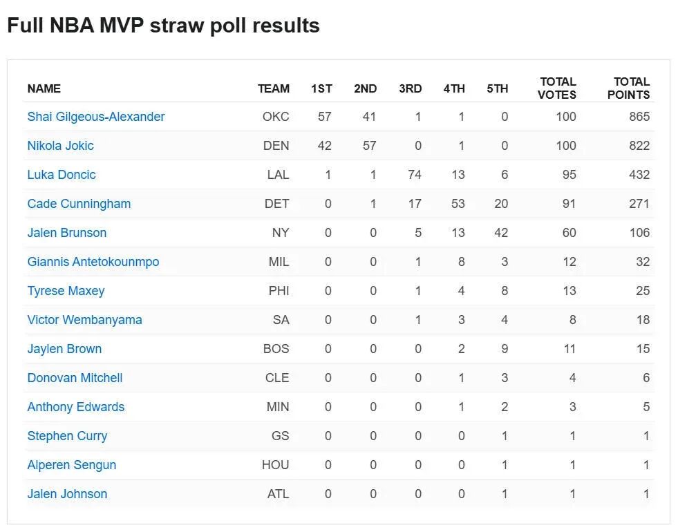 当时也是亚历山大排在第一位,他得到了57张第一选票,总得分865分,领先第二的约基奇(42张第一选票、总得分822分)并不是很多。