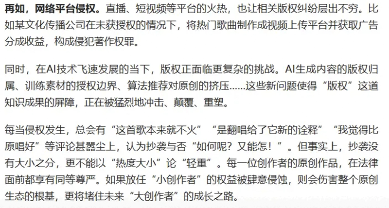 随着事件不断升级发酵,官媒人民日报都坐不住了,发文突出强调了行业版权问题,尤其对滥用AI技术做出明确表态。