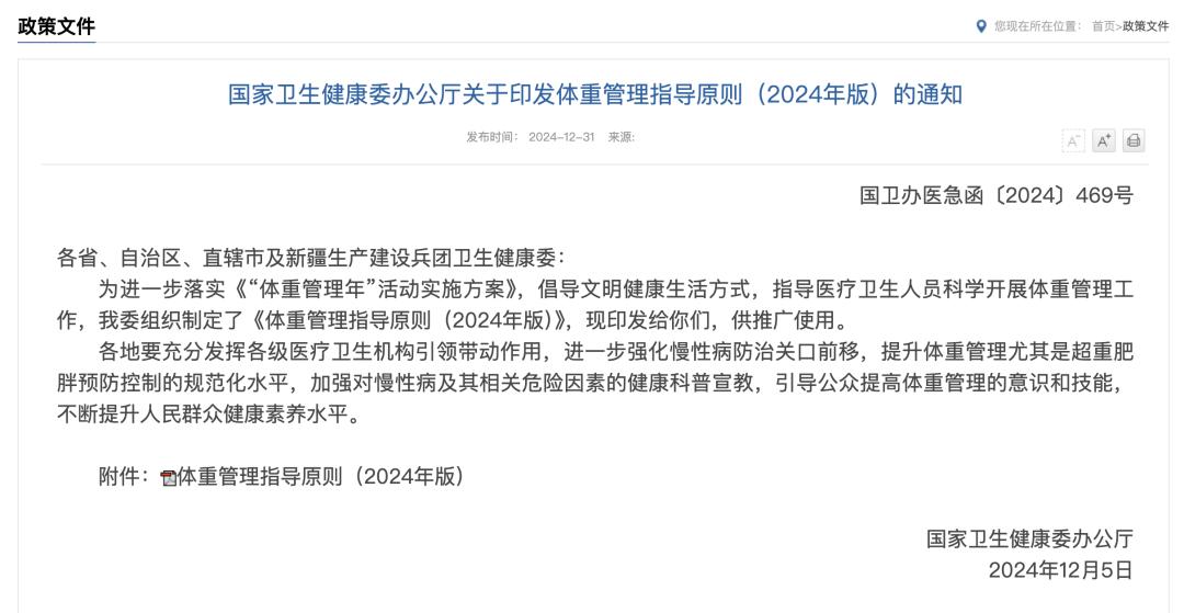 与此同时,政策侧正在把体重管理推向更规范的医疗服务框架。国家卫健委已印发《体重管理指导原则(2024年版)》并提出推广应用要求。2025年4月发布的《关于做好健康体重管理门诊设置与管理工作的通知》进一步把门诊建设落到医院端,文件明确多学科接诊配置,覆盖儿科、全科、内分泌、临床营养、精神心理、康复医学、中医等专业,并推动相关医院在2025 年6月底前实现门诊设置的覆盖目标。