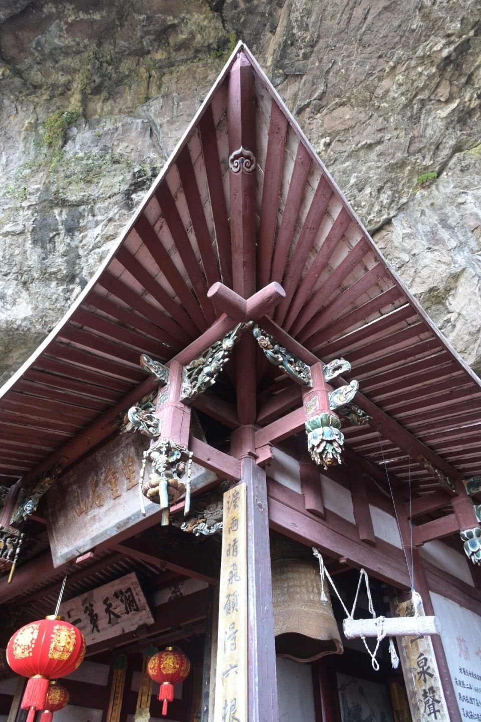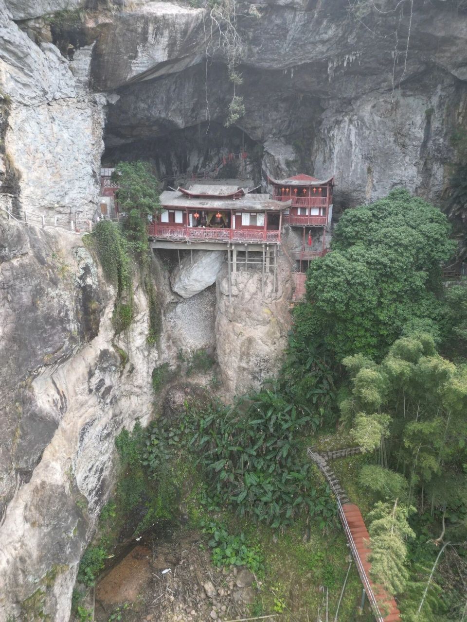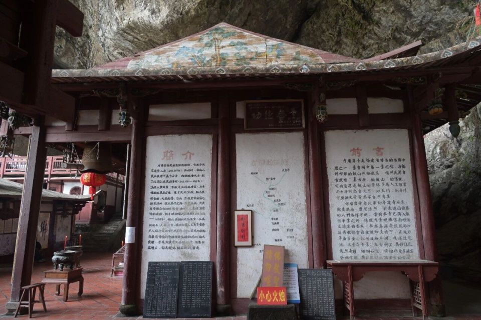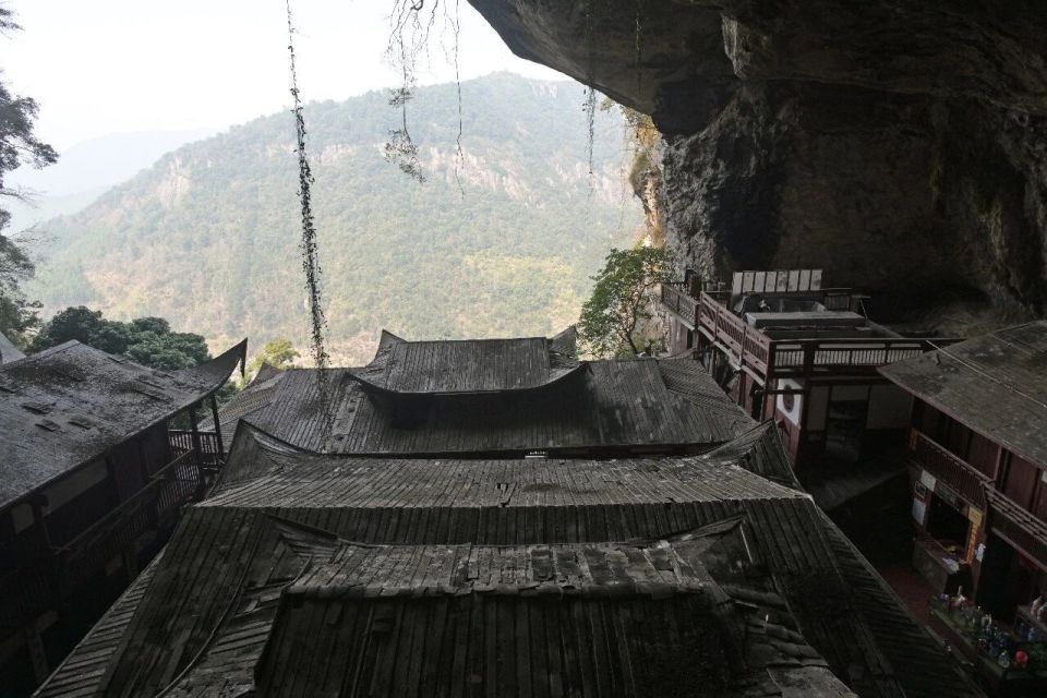 方广岩寺藏身于巨大的岩洞中,山岩为瓦,巨石为基,杉木支撑,楼阁耸立,就这样屹立于岩壁之间数百年了。