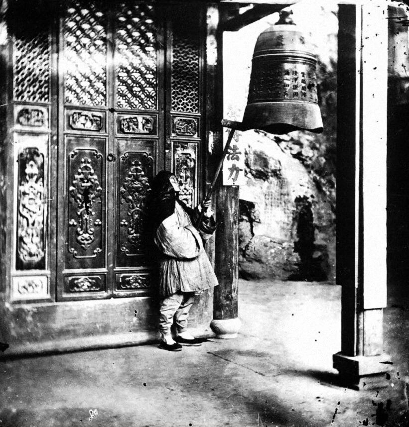 传统的的古建筑与自然的山岩相映成趣,屋檐下那口巨钟,位置正和约翰·汤姆森拍摄敲钟人的那张照片一致。