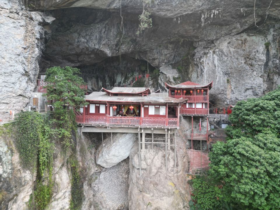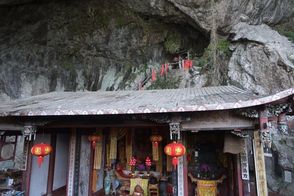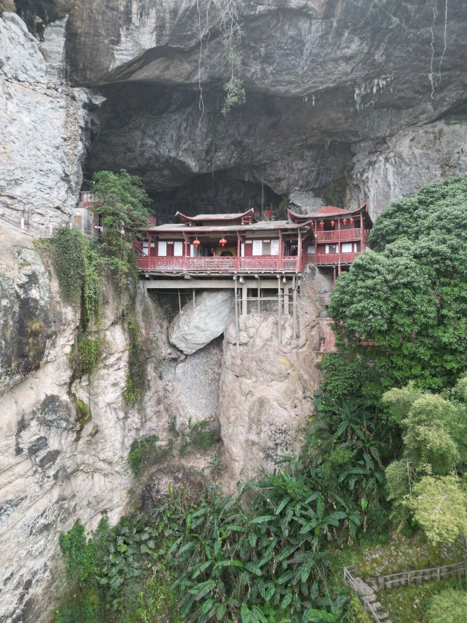 岩壁上悬挂着钟乳石群,形成蛟龙入水、童子拜观音等独特岩景,自然景观与人造建筑在岩洞中得以完美结合。