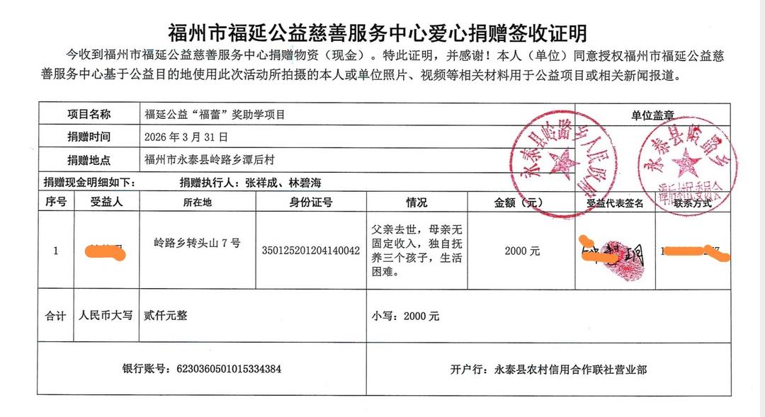作为福延公益核心品牌项目,“福蕾”奖助学项目自启动以来,始终聚焦家庭困难但品学兼优的学子,累计已助力全国多地5323名学子完成学业,曾荣获福建省民政厅、福建省慈善总会联合颁发的“善行八闽”三等奖。此次发放的2000元善款,正是该项目精准帮扶理念的生动实践——每一笔捐赠都来源清晰、去向透明,每一次发放都紧扣真实需求,以专业规范的流程守护爱心温度。