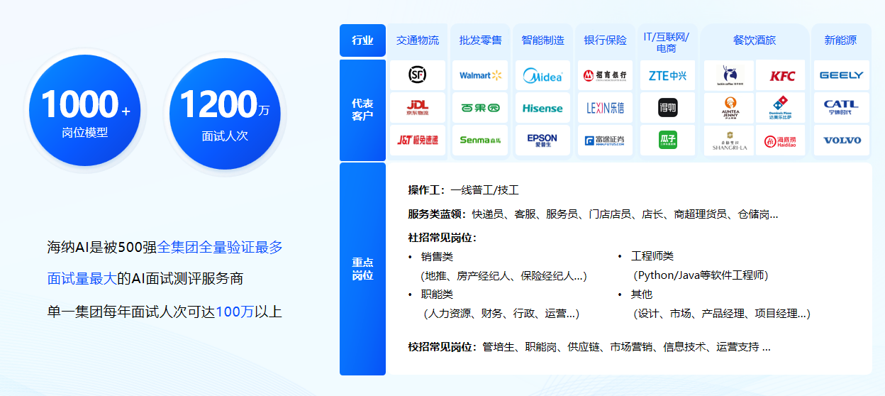 通过构建全国性的招聘人才模型,海纳AI实现了招聘流程的全面自动化,包括7×24小时总部直聘、自动邀约、自动面试、自动评估等功能,尤其适合大规模蓝灰领招聘、校园招聘以及白领初阶岗位招聘。目前,海纳AI已经成为全国面试人次最多的AI面试服务商,已为顺丰、沃尔玛、瑞幸咖啡、美的等100多家500强集团面试超1200万人次。其大规模、高并发的AI招聘服务能力,印证了海纳AI在数据智能赋能人力资源领域的领先地位。