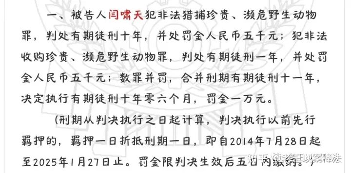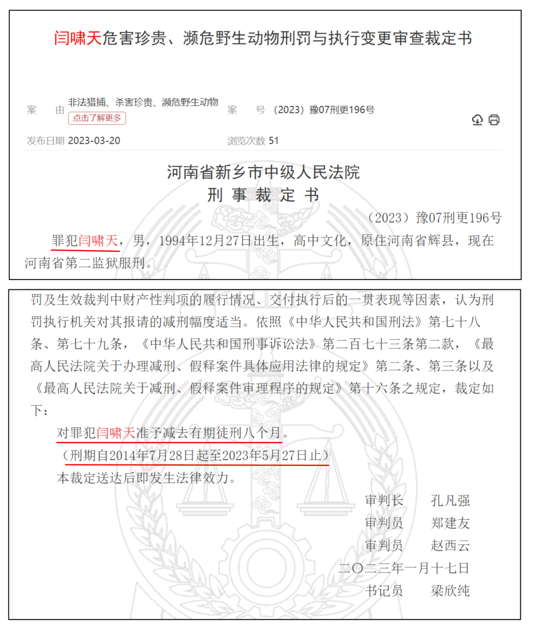 案件经过多次开庭后,最终,2015年辉县法院以非法收购、猎捕珍贵、濒危野生动物罪,判处闫啸天有期徒刑10年六个月,处罚金1万元;