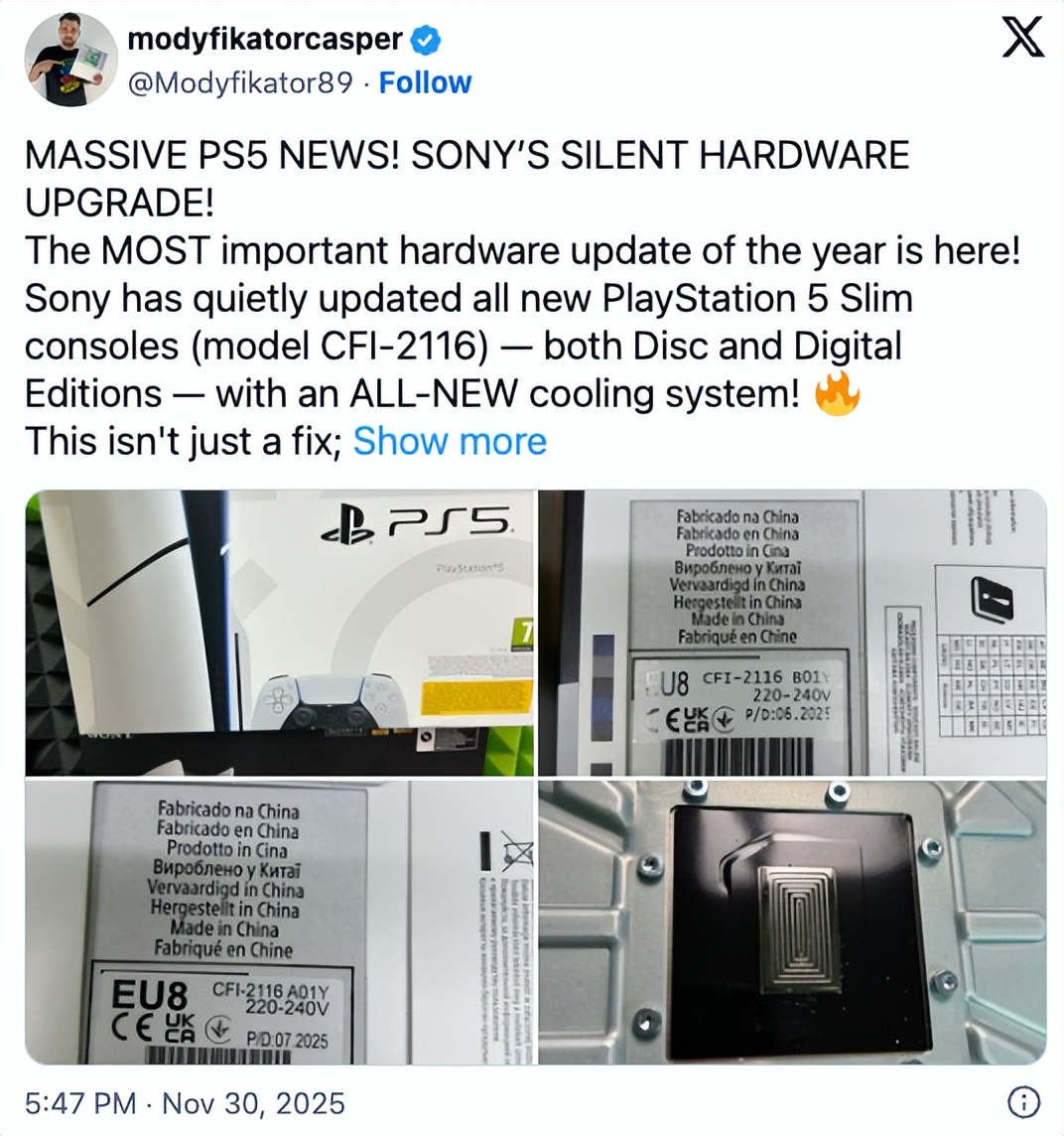 硬件拆解玩家 Modyfikator89 发现:从 CFI-2116 这个新批次开始,PS5 Slim 的 APU 散热片结构悄悄变了。