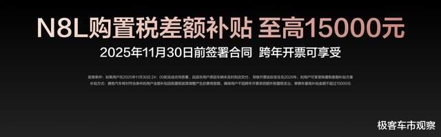 为回馈广大用户的支持与信赖,腾势N8L特别推出限时购车权益,权益价值至高10.67万元!包括价值1.7万元的三年免息,最高1万元的置换补贴。此外,不必担心因为交车晚,享受不到购置税补贴:在2025年11月30日24点前完成合同签署的用户,如果因非用户原因车辆未及时交付,导致开票实际发生在2026年,可享受购置税差额补贴,最高1.5万元!