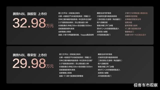 10月28日,“大六座安全豪华SUV”腾势N8L正式上市,共推出2款车型,官方指导价为29.98万元~32.98万元!N8L全系标配“六大核心科技”,以超越传统豪华的品质标准,打造科技出行移动空间,诠释家用车的豪华感、安全感与科技感,创造让全家人动心、舒心、省心、安心、暖心的出行体验,以“五心体验 三感相伴”,定义美好出行。