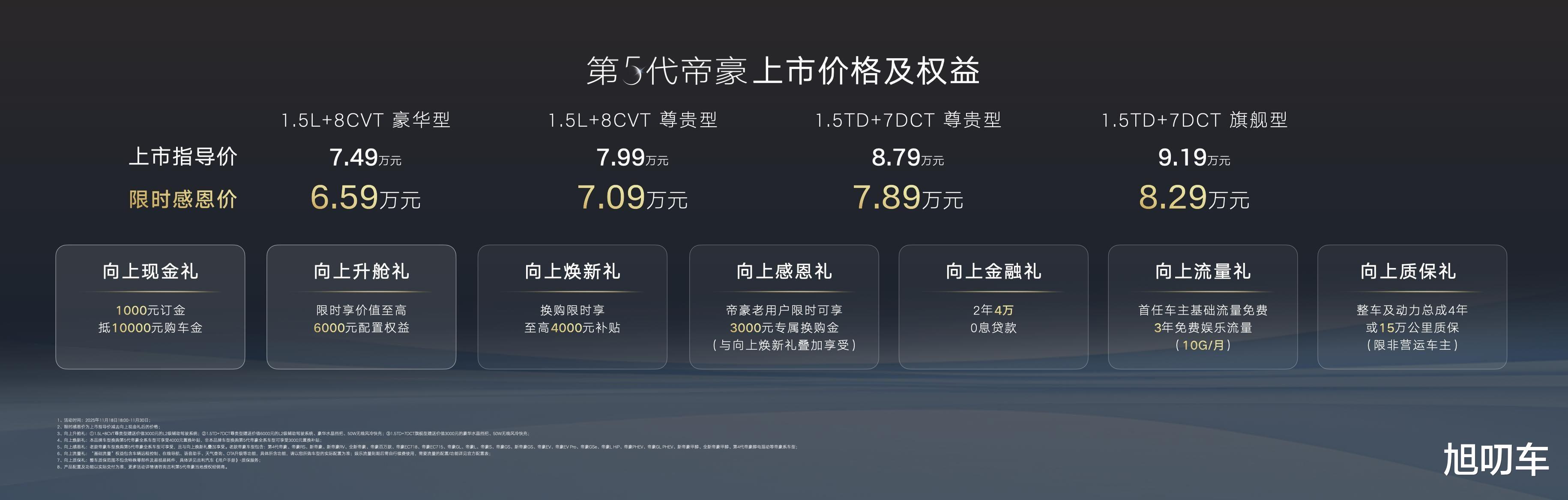 第5代帝豪即日起推出7重上市礼遇,2025年11月30日前购车用户,可享包含1000元订金抵10000元购车金的向上现金礼;限时享价值至高6000元配置权益的向上升舱礼;换购限时享至高4000元补贴的向上焕新礼;帝豪老用户可享3000元专属换购金的向上感恩礼(与向上焕新礼叠加享受);2年4万0息贷款的向上金融礼;首任车主基础流量免费,3年免费娱乐流量(10G/月)的向上流量礼;整车及动力总成4年或15万公里质保(限非营运车主)的向上质保礼。除此之外,作为帝豪持续越级向上,给用户带来超越期待体验精神的延续,用户还可选装千里浩瀚辅助驾驶H3方案。