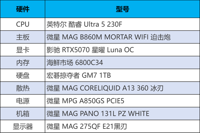 配置推荐其核心是英特尔酷睿Ultra 5 230F处理器与微星 MAG B860M MORTAR WIFI 迫击炮组成的稳定高效平台,为整机奠定了坚实的性能基础。