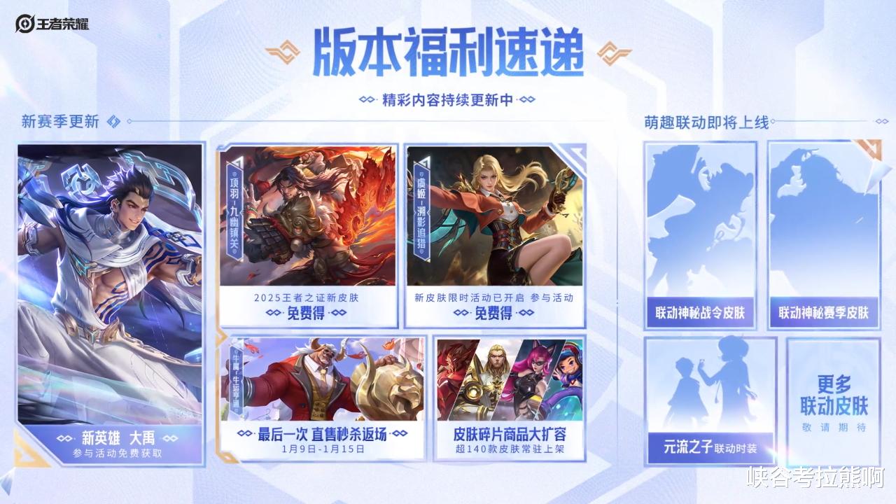除了已经曝光的年赛史诗皮肤【项羽-九幽镇关】之外,官方还曝光了【牛魔-牛运亨通】的最后一次直售秒杀返场,价格为60点券。另外,萌趣联动的2款新皮肤也将在新赛季曝光上线,从目前的剪影来看,这一对儿皮肤似乎不难猜到吧?而更多联动皮肤里不知道会不会有《哪吒2》里敖隐和哪吒的联动皮肤。当然,其他联动IP我们也很期待!