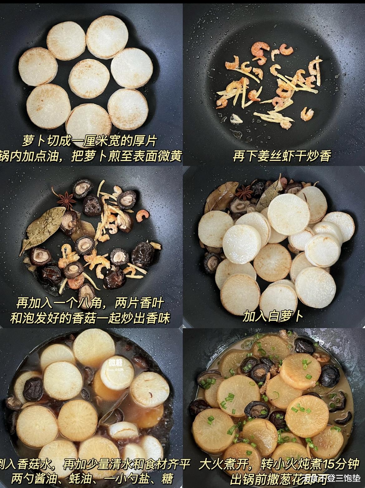 接下来的烹饪过程,每一步都在为最终的鲜美积蓄力量。热锅凉油,油热后先放入几片姜和一瓣八角爆香,然后倒入切好的萝卜块,用中火慢慢煎炒。这一步很重要,将萝卜煎至表面微微发黄,可以有效去除它的辛辣味,同时激发出清甜的本味。煎好的萝卜推到锅边,放入泡好的香菇,连同泡香菇的水一起倒入锅中,再加入适量的生抽、蚝油、少许老抽调色和一点点糖提鲜。如果家里有玉米淀粉,可以调一点水淀粉备用,最后用来勾芡,让汤汁更加浓稠挂味。