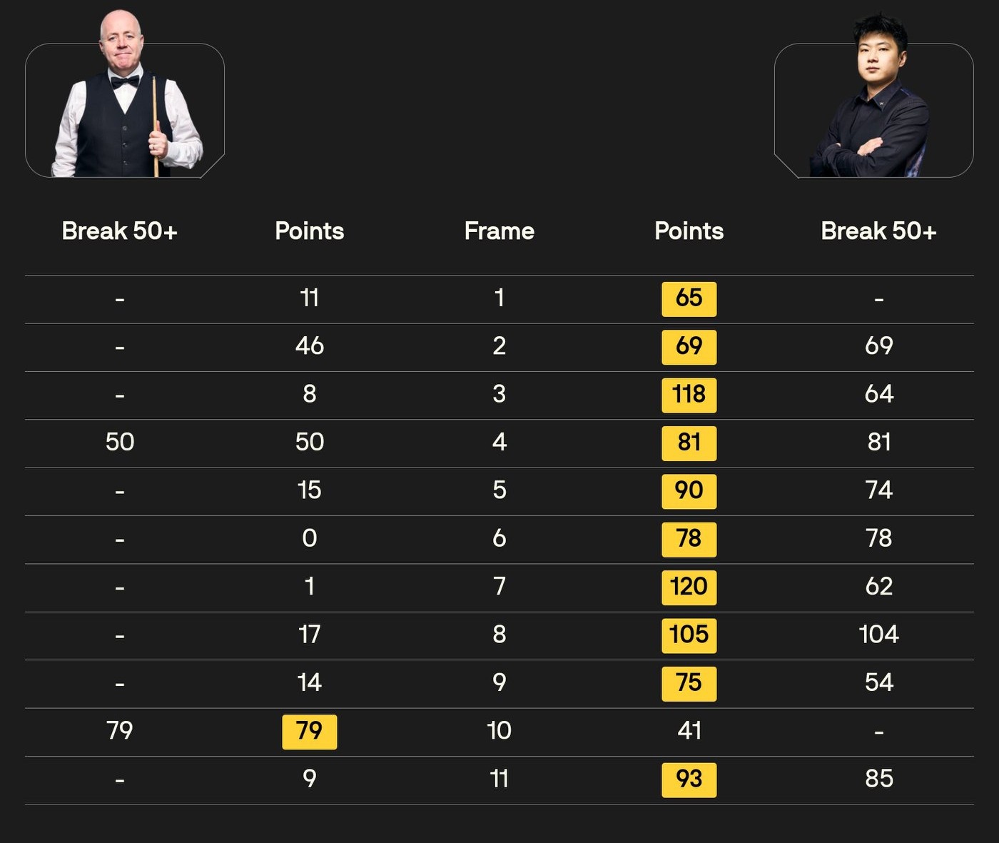 全场数据统计详情如下图。赵心童八杆50+,一杆100+,战斗力爆表。而希金斯只有两杆50+,完全被赵心童按在椅子上。