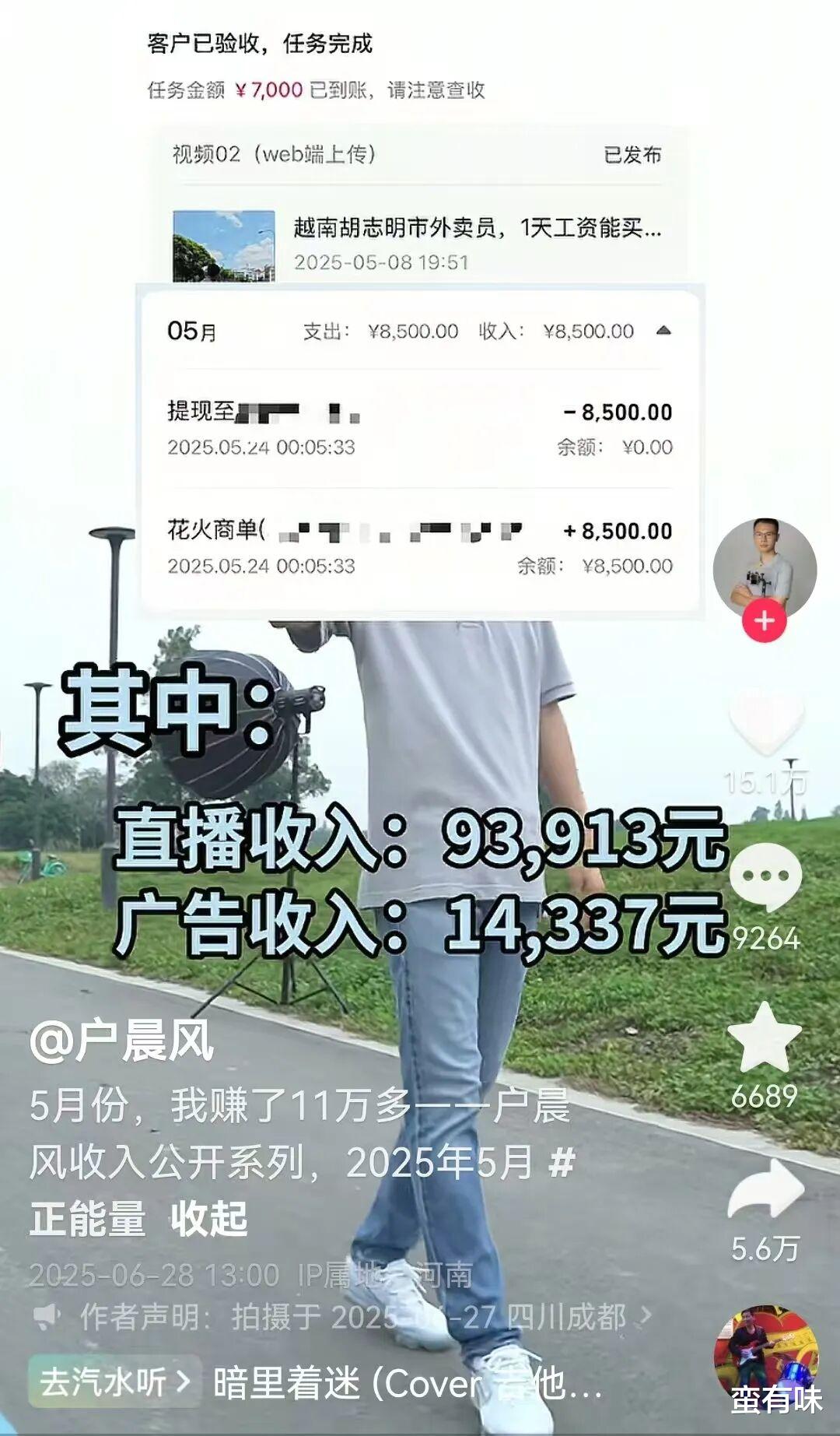 他们这么折腾图啥?当然是图钱啊。直播打赏是来钱最快的方式,户晨风今年五月一个月就收了九万四的打赏。他还搞什么收费短视频业务,给人送句“越来越苹果”的祝福就要价2999,还真有人买单。