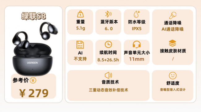 绿联S8单耳5.1g,记忆钛丝耳夹能随便掰,壶嘴设计贴合耳道,跑步走路都稳,IPX5防水连运动暴汗也不怕。但耳夹力度偏紧,戴超2小时耳廓会有点压得慌,耳背厚的朋友得更留意舒适度。