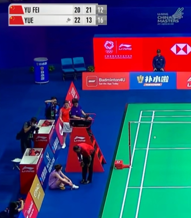 12-16落后时,陈雨菲叫了医疗暂停,把她在世锦赛上受伤的右脚拿出来给医生看了一看,但由于羽毛球比赛关于医疗暂停的奇葩规定,并没有采取任何措施。