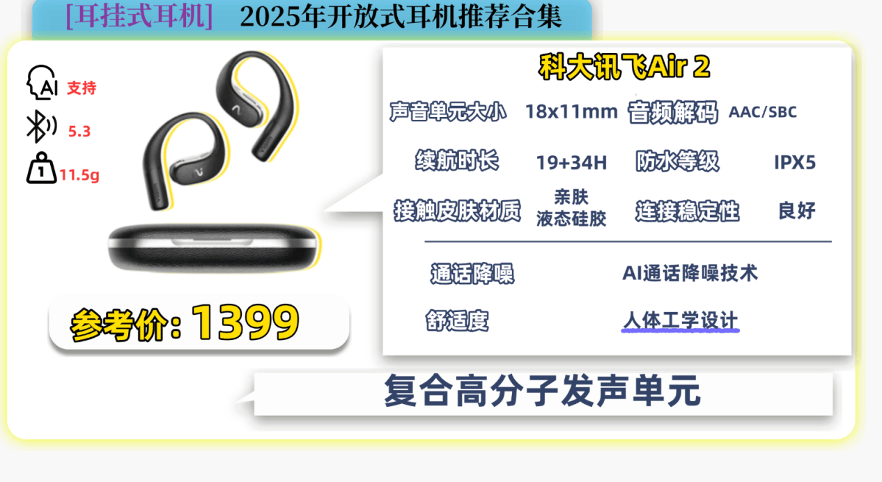 耳挂式耳机推荐3.科 大讯飞Air 2