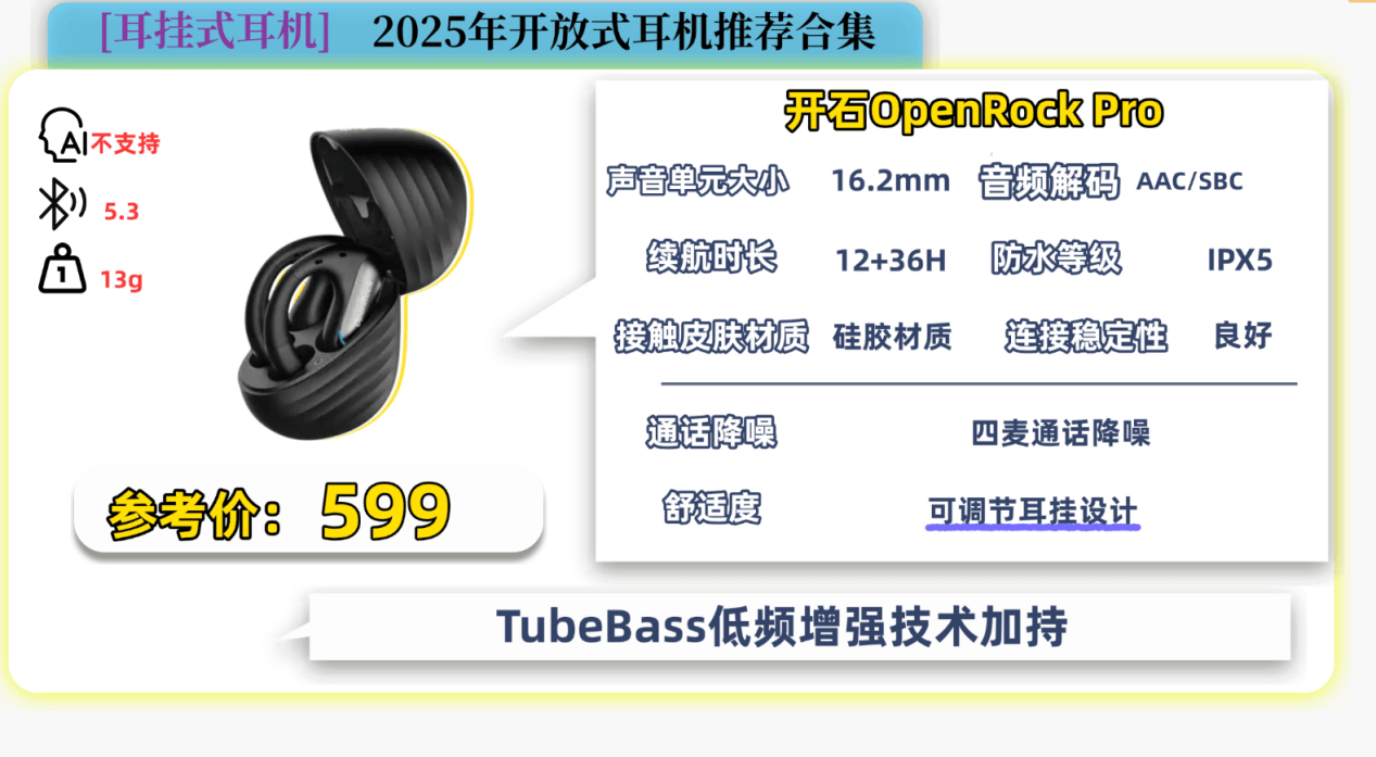 配置与功能上,开石OpenRock Pro支持蓝牙5.3,连接稳定性有基础保障。它配备四麦克风通话降噪系统,能有效拾取人声并抑制环境噪声。续航是其显著优势,单次续航达12小时,配合充电盒总续航为36小时。