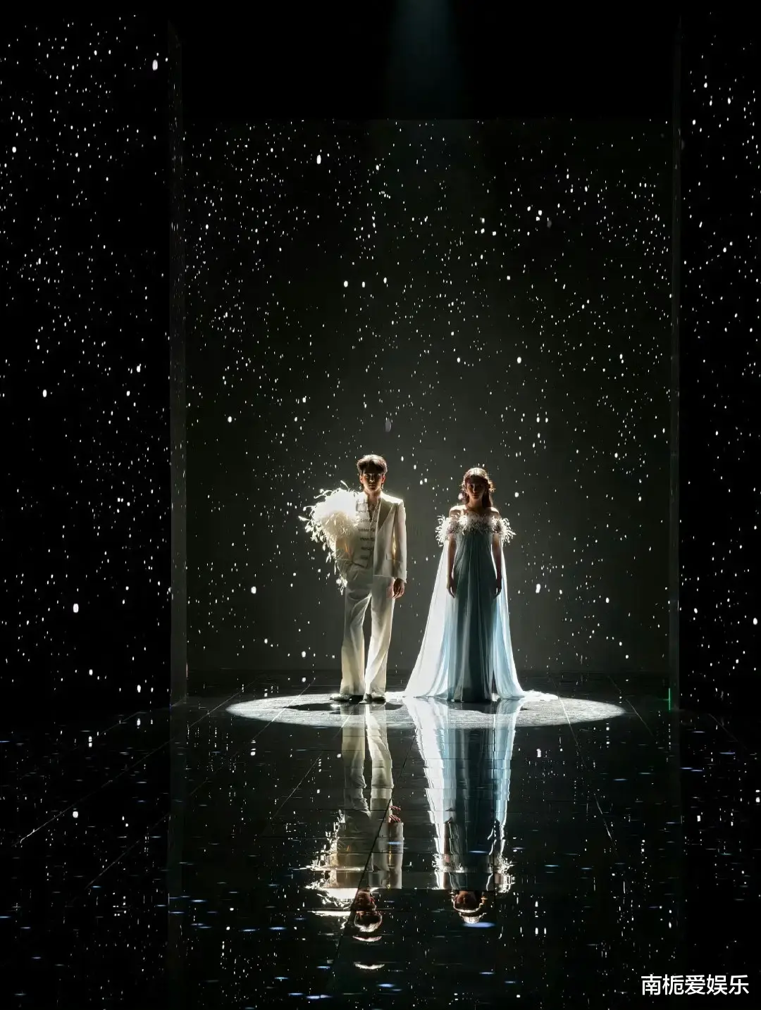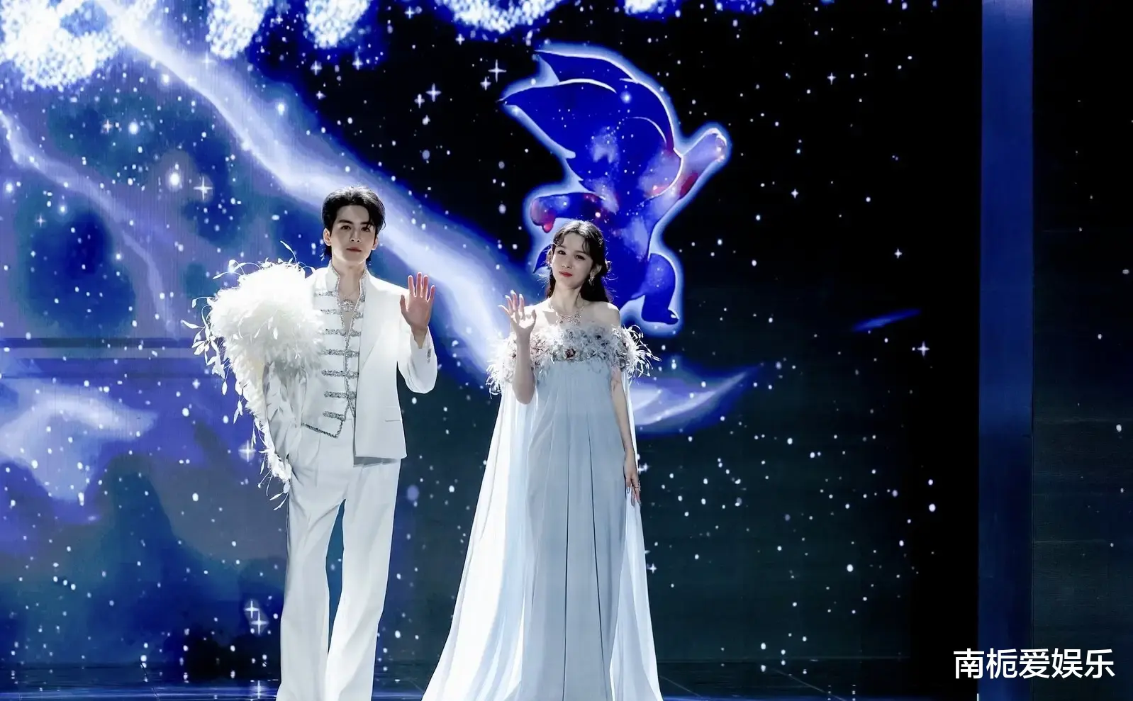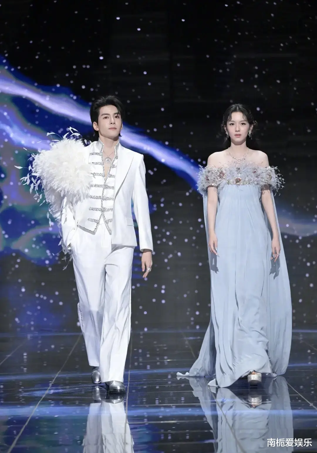 当晚,曾舜晞身着纯白戗驳领西装,肩披层叠羽毛披肩,冷光映照下骨相分明,气质矜贵疏离,宛如从童话中走出的“仙品白马王子”;周也选择一袭淡蓝色抹胸羽毛纱裙,裙摆轻盈流动,肩部羽饰随步微颤,搭配低饱和哑光妆容与珍珠耳饰,宛若古典油画中的“深海神女”。蓝白配色与星空主题遥相呼应,被媒体盛赞为“行走的画报”。