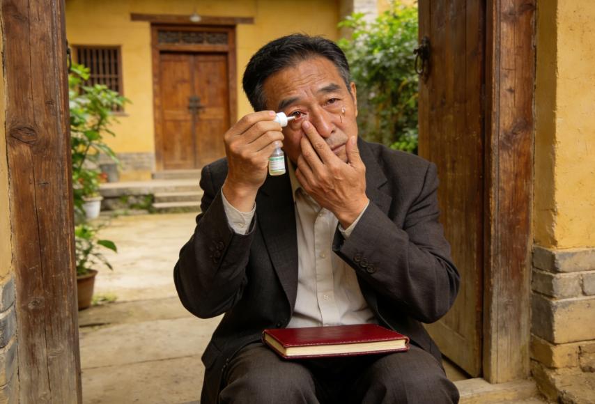 他伸出左手,指尖小心翼翼地扒开右眼的下眼睑,眼睛一眨不眨地向上盯着瓶口,全身紧绷得像是一根张满的弓弦,生怕这一滴药水点歪了位置。