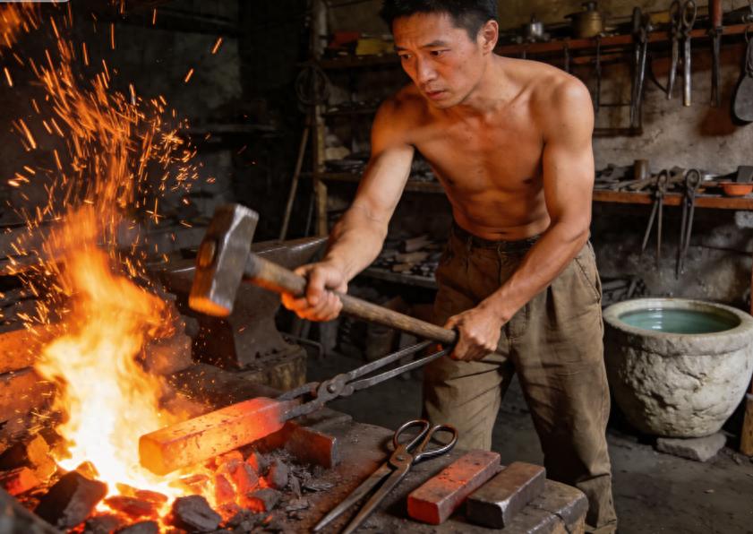 60岁的罗铁生赤着胳膊,手里那把十几斤重的铁锤一下下砸在通红的铁坯上,火星四溅。他是这方圆百里最后一位手工铁匠,打出的菜刀切肉不卷刃,打出的锄头下地有劲。