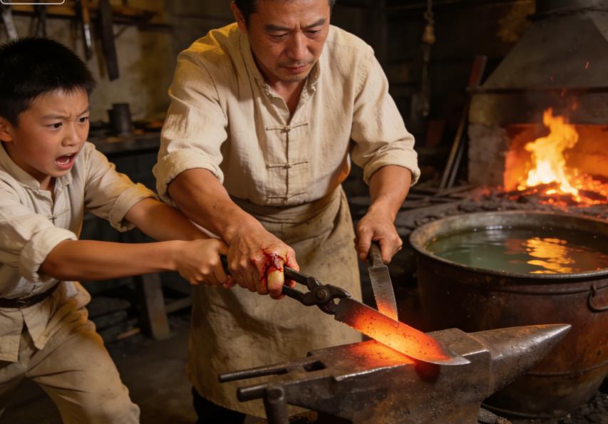 就在铁刀入水的那一瞬间,他因为看不准位置,手里的铁钳夹歪了,通红的刀刃贴着他的右手虎口划了过去,差点把半个手掌都给切了。