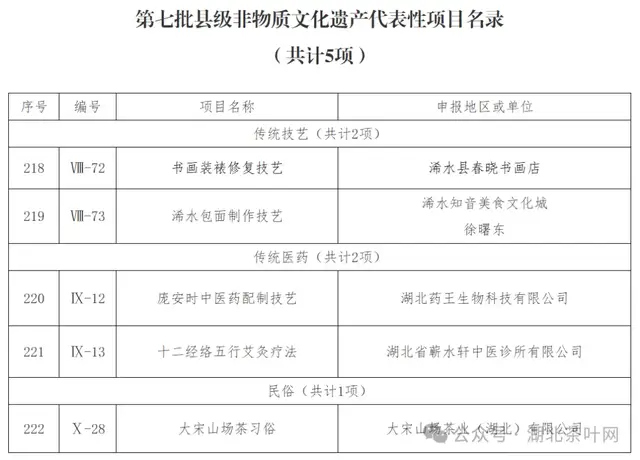 (湖北茶叶网 消息)1月8日,浠水县文化和旅游局发布《关于浠水县第七批县级非物质文化遗产代表性项目名单的公示》,“大宋山场茶习俗” 成功入选,为湖北丰富的茶类非遗版图再添重要一员。