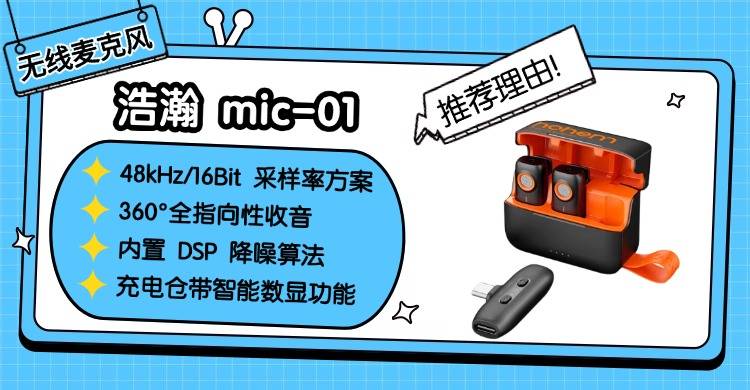 浩瀚 mic-01搭载了48kHz/16Bit 采样率方案,配合高保真拾音单元,能还原自然真实的人声质感;而且内置 DSP 降噪算法,能有效过滤室内外环境杂音,不管是室内录制还是户外拍摄,收音都干净清晰。并且它的机身采用轻量化设计,夹在衣服上几乎没什么存在感;充电仓带智能数显功能,剩余电量一目了然,不用猜来猜去担心没电。兼容性覆盖手机、相机、运动相机,即插即用,不用额外搭配转接头。