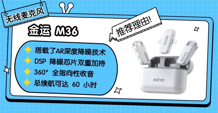 金运 M36搭载了 AR 深度降噪技术与 DSP 降噪芯片双重加持,能一定程度抑制环境杂音,提升录音纯净度;而且拥有360° 全指向性收音拾音范围宽广且定位精准,还支持立体声录音模式;同时搭配32kHz/16Bit 采样率保障基础音质,日常录语音、简单短视频完全够用。苹果和安卓双接口设计,兼容市面上大多数设备,即插即用不用额外买转接头;而且单次续航达 8 小时,搭配 800 毫安大容量充电仓,总续航可达 60 小时,不用频繁充电;操作简单易上手,新手也能快速投入创作。